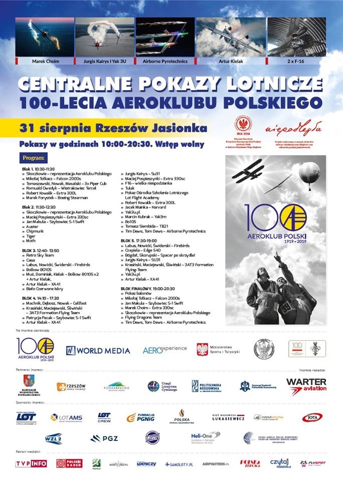 W ostatnią sobotę wakacji fani lotnictwa będą mogli zobaczyć najlepszych polskich pilotów akrobacyjnych m.in. Artura Kielaka i Roberta Kowalika. Na podkarpackim niebie będzie można także podziwiać kilkadziesiąt statków powietrznych (samoloty, śmigłowce, wiatrakowce, motoparalotnie, spadochrony). Nie zabraknie też mistrzów akrobacji lotniczej z zagranicy jak i grup pokazowych na kilka samolotów (Retro Sky Team).