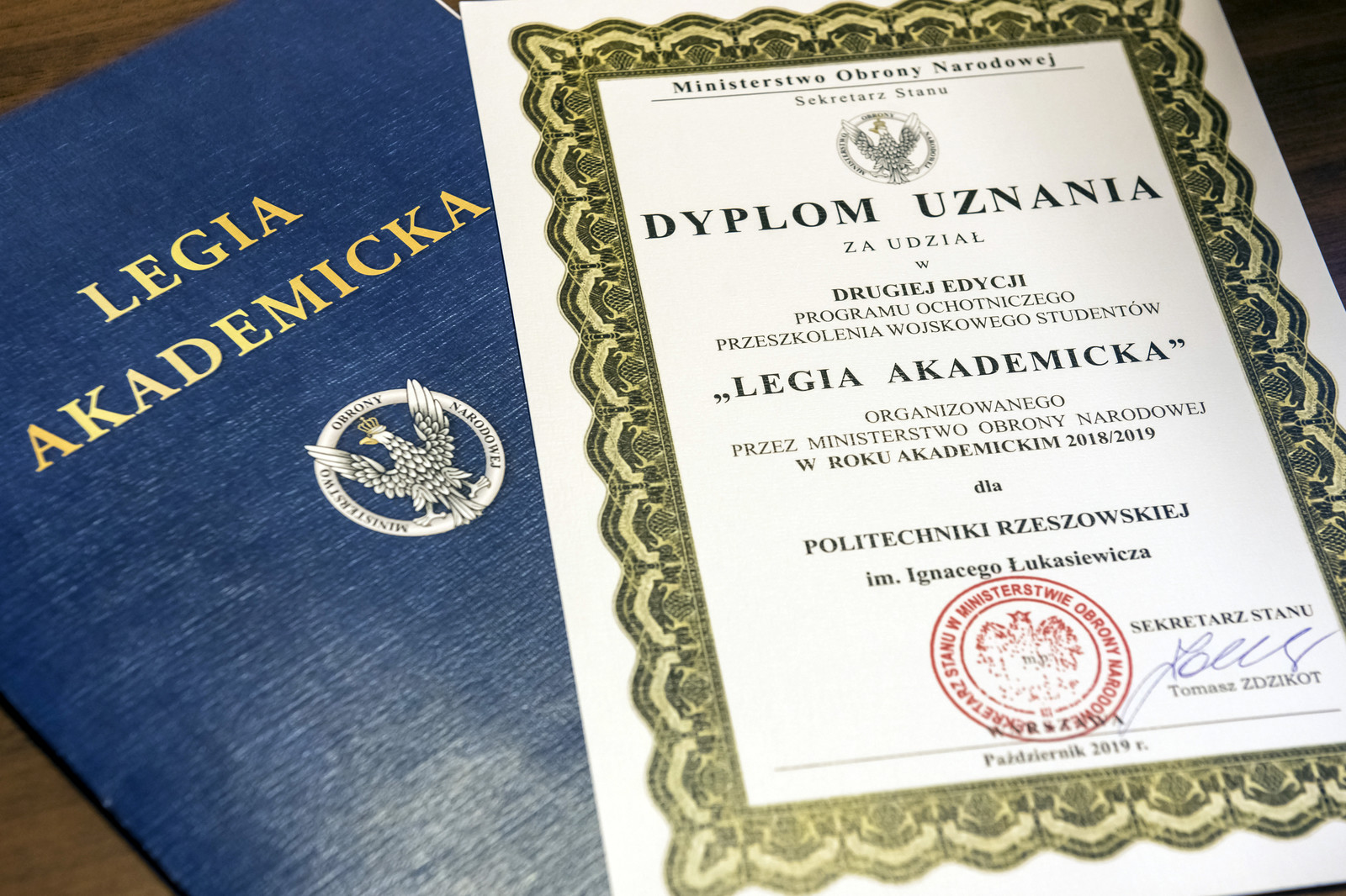W dniu 28 października 2019 r. w Akademii Sztuki Wojennej podczas narady szkoleniowo-metodycznej Tomasz Zdzikot Sekretarz Stanu w Ministerstwie Obrony Narodowej wręczył dyplomy uznania uczelniom, które osiągnęły wysoki poziom naboru studentów do programu Legia Akademicka. Politechnika Rzeszowska zajęła drugie miejsce w kraju rekrutując na ochotnicze przeszkolenie wojskowe 214 studentów w roku akademickim 2018/2019.