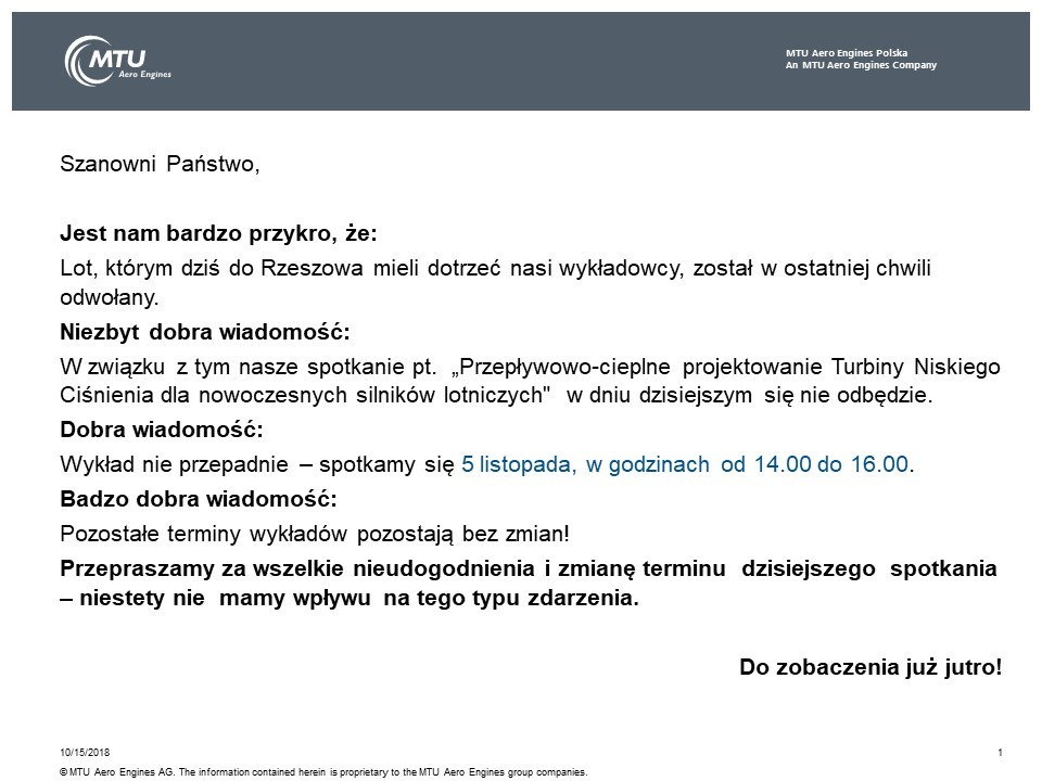 Wykład E. Henricha "Przepływowo-cieplne projektowanie Turbiny Niskiego Ciśnienia dla nowoczesnych silników lotniczych" zaplanowany pierwotnie na 15 października, z przyczyn niezależnych od organizatora zostaje przełożony na 5 listopada br. (godz. 14.00- 16.00).