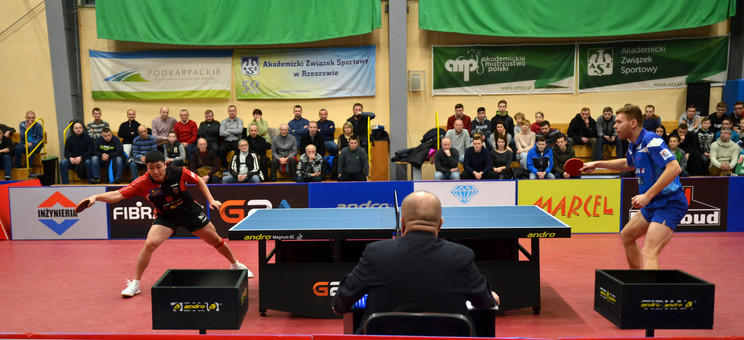 Gdy akademicy zobaczyli, że zagrają Gao Ning wraz z Gionisem i Górakiem, wiedzieli, że o jakiekolwiek punkty będzie bardzo ciężko. Losowanie było korzystne dla gospodarzy, którzy chcieli, aby Lewandowski zagrał z Górakiem. Pierwsza partia i pierwsze emocje. Doskonale usposobiony Lakeev wygrał dwa sety z Gao i w trzeciej partii miał trzy setbole, których nie wykorzystał. Gao doprowadził do wyrównania w setach i na myśl przyszło siatkarskie powiedzenie: kto nie wygrywa 3:0, ten… wygrywa 3:2! Vasilij udowodnił, że w tenisie stołowym funkcjonują inne reguły. Druga partia dla zawodnika gości Gionisa, który pokazał, że jego pozycja w światowym rankingu (35.) nie jest przypadkowa. Z nieźle grającym na obronę Gołębiowskim wygrał 3:0, imponując… bezbłędnym atakiem forhendowym. W trzeciej partii doszło do pojedynku mającego doskonały sezon międzynarodowy (wicemistrzostwo Europy w deblu) i ligowy (3. w rankingu supeligi) Góraka z Lewandowskim. Górak chciał udowodnić, że porażka w ostatnim czempionacie Polski z „Lewym” to był przypadek. Nic z tego. Lewandowski, po wspaniałym, obfitującym w wymianę widowiskowych top spinów pojedynku, wygrał 3:2 i jeden punkt był już w Rzeszowie! Na tym jednak nie koniec. Będący w gazie straniero miejscowych udowodnił umiejętność gry Rosjan przeciwko obrońcom. Grek zdobył w dwóch setach zaledwie 10 punktów i sensacja stała się faktem. Zwycięzcy pokazują, że tak wyrównanych rozgrywek ligowych w Polsce jeszcze nie było – każdy może wygrać z każdym, co dzieje się niemal w każdej kolejce. LOTTO Superliga jest nie tylko najmocniejszą, lecz także najbardziej wyrównaną europejską ligą.