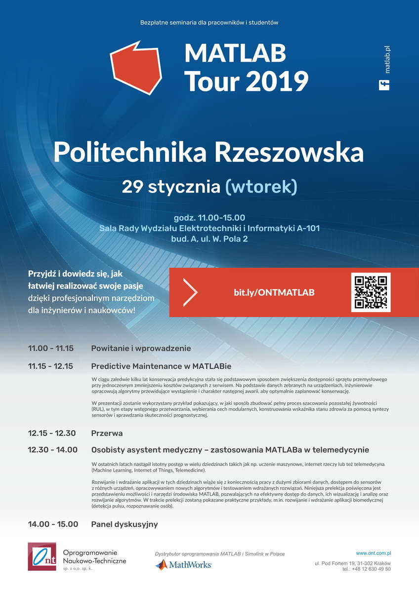 Podczas wydarzenia zaplanowano przegląd zagadnień dotyczących oprogramowania MATLAB, jego zastosowania w telemedycynie i Predictive Maintenance oraz podstawowe informacje o dostępnej licencji ogólnouczelnianej. Organizatorem spotkania jest firma Oprogramowanie Naukowo-Techniczne z Krakowa (ONT), oficjalny dystrybutor oprogramowania MATLAB w Polsce.