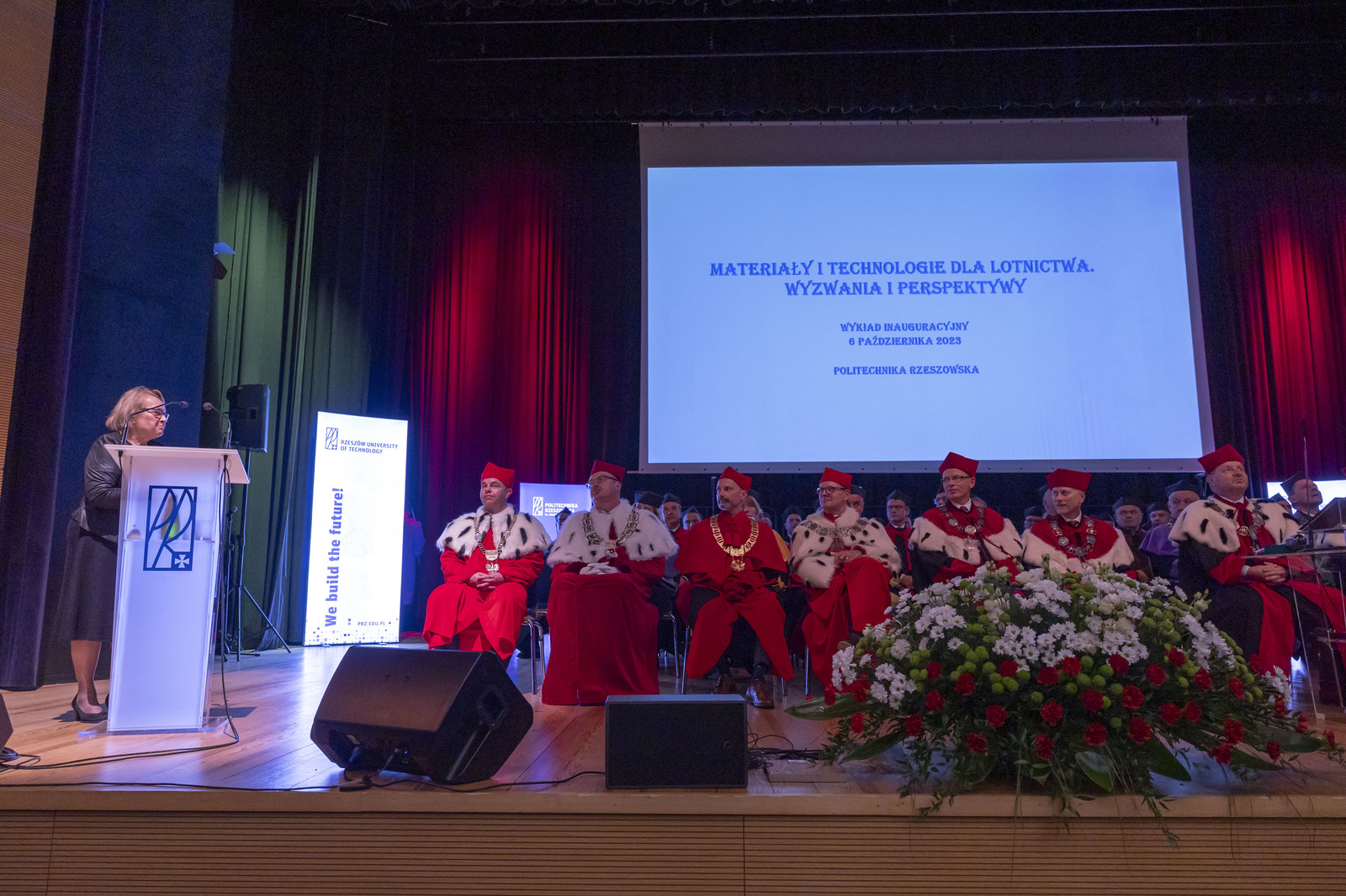 „Droga Młodzieży Akademicka, Szanowni Zebrani zgodnie z tradycją ogłaszam rok akademicki 2023/2024 na Politechnice Rzeszowskiej za rozpoczęty” – powiedział JM Rektor, uderzając trzy razy berłem, a Chór Akademicki odśpiewał Gaude Mater Polonia. Wykład inauguracyjny „Materiały i technologie dla lotnictwa. Wyzwania i perspektywy” wygłosiła prof. dr hab. inż. Romana Ewa Śliwa.