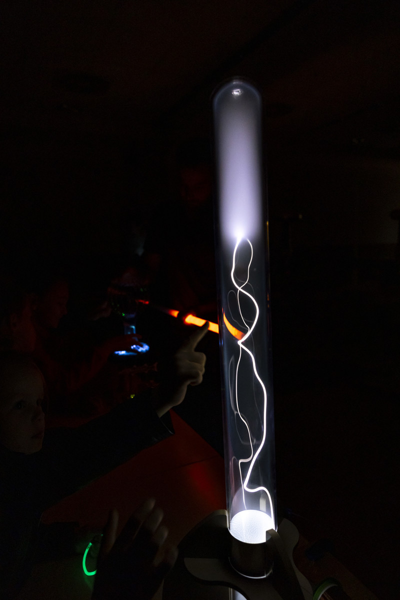 Najbardziej wyczekiwaną atrakcją Nocnych Spotkań z Nauką był „Teatr wysokich napięć”. Do tego widowiskowego spektaklu wykorzystany został jeden z największych w swojej klasie transformatorów Tesli. Kilkumetrowe wyładowania, które w rytm muzyki rozświetlały mrok, wzbudziły zachwyt widowni.
