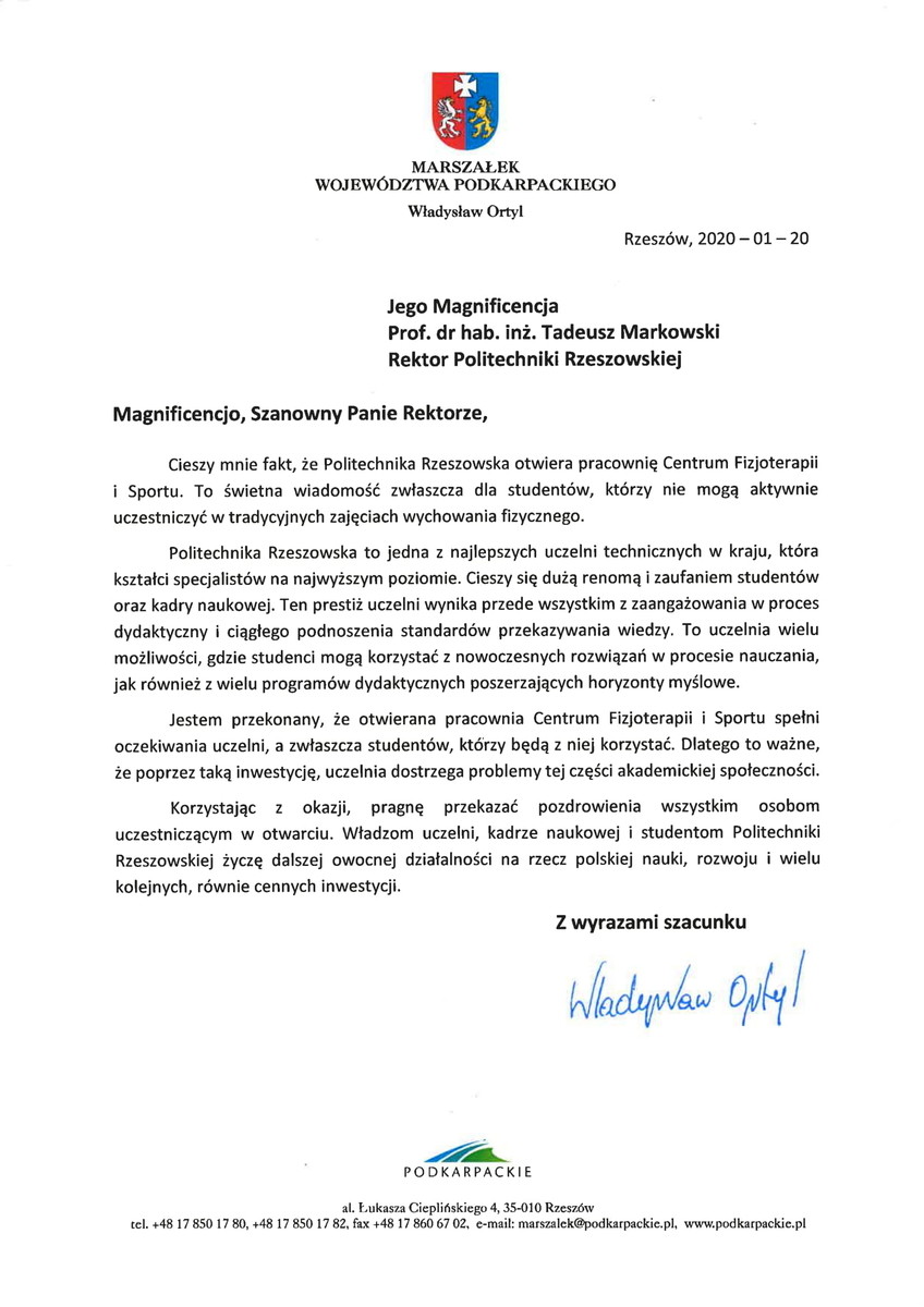 Otwarcia dokonał Rektor Politechniki Rzeszowskiej prof. dr hab. inż. Tadeusz Markowski. -Oddajemy dziś do użytku miejsce, które służyć będzie usprawnieniu ruchowemu studentów, którzy z uwagi na stan zdrowia nie są w stanie uczestniczyć w tradycyjnych formach wychowania fizycznego. Alternatywne formy zajęć WF-u są wprawdzie prowadzone w naszej Uczelni od ponad 30 lat, jednak Uczelnia się rozrasta - a co za tym idzie - z roku na rok przybywa studentów przebywających na długoterminowych zwolnieniach lekarskich oraz studentów z niepełnosprawnościami. Podyktowało to konieczność rozbudowy specjalistycznej pracowni dedykowanej tej grupie studentów - powiedział prof. Markowski.