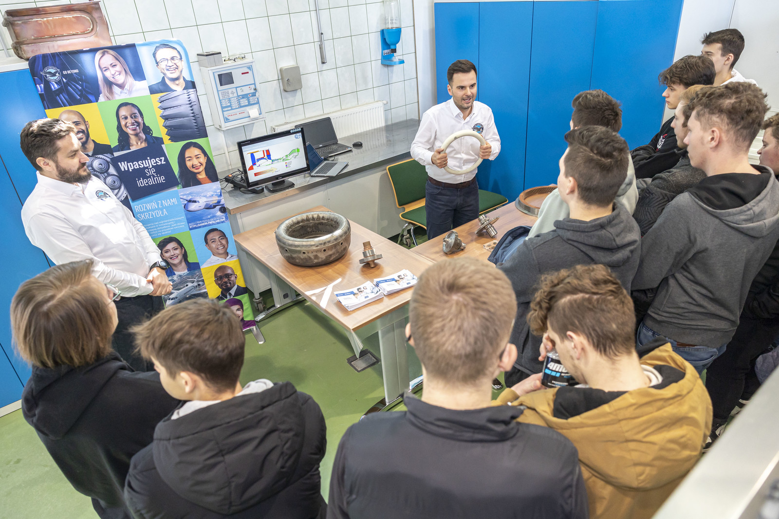 Organizatorzy zadbali również o możliwość kontaktu z przedstawicielami przemysłu. O znaczeniu inżynierii materiałowej dla przemysłu lotniczego czy motoryzacyjnego opowiedzieli absolwenci kierunku inżynieria materiałowa, obecnie pracownicy tak znanych firm, jak Pratt & Whitney Rzeszów czy BorgWarner Poland. Można było zobaczyć i dotknąć elementów konstrukcji silników lotniczych czy przekładni automatycznych stosowanych w nowoczesnych samochodach. Młodzież miała okazję dowiedzieć się, czym zajmują się inżynierowie materiałowi i na czym polega ich praca.