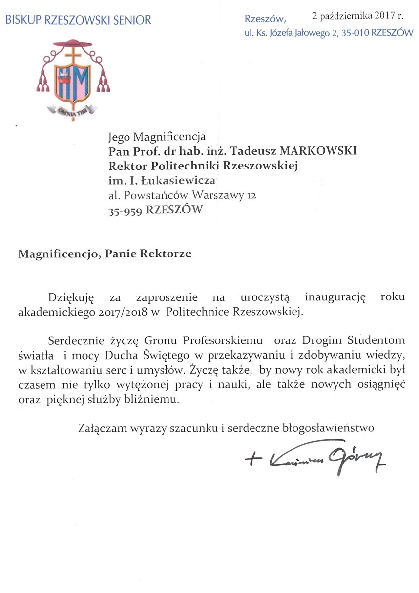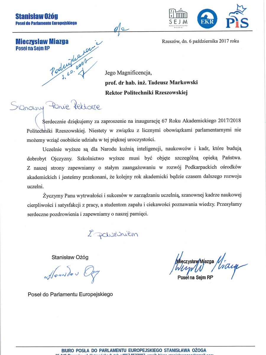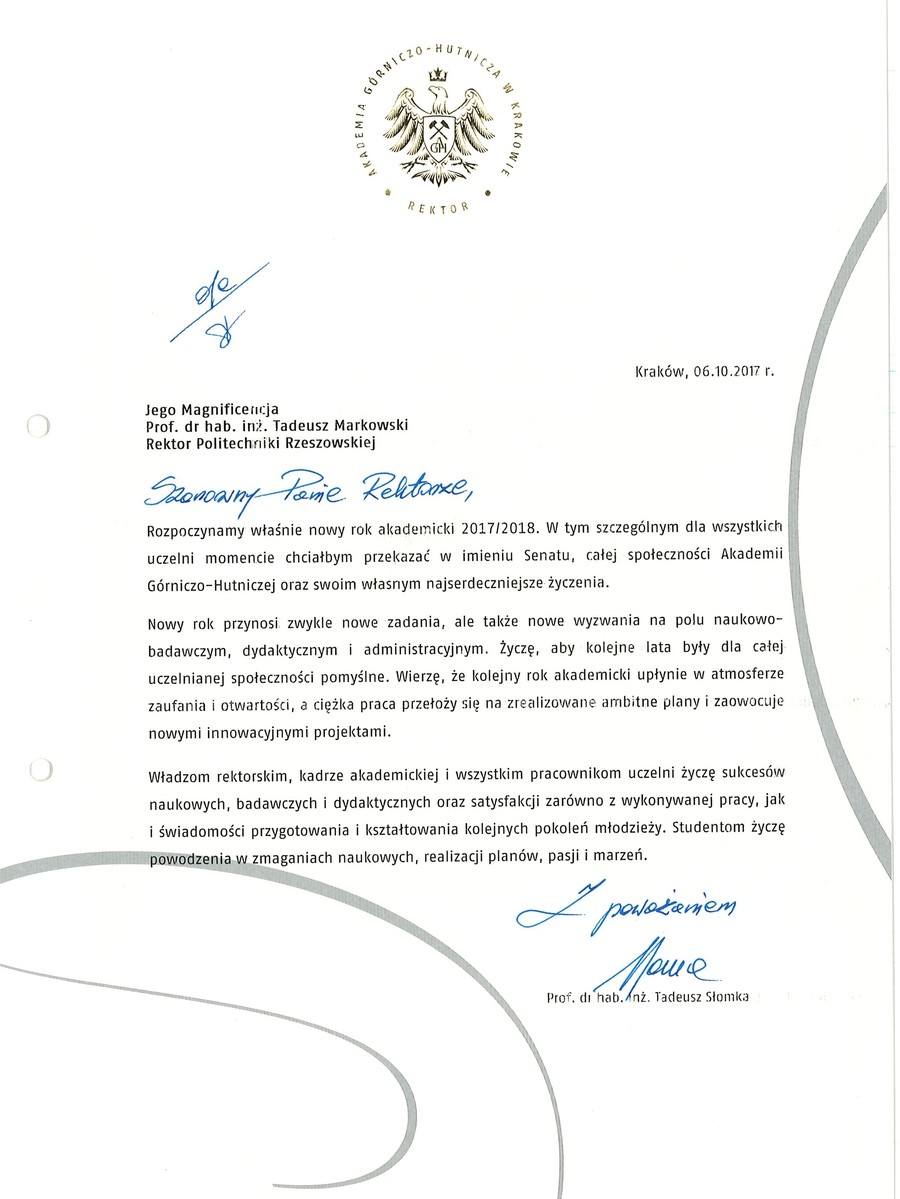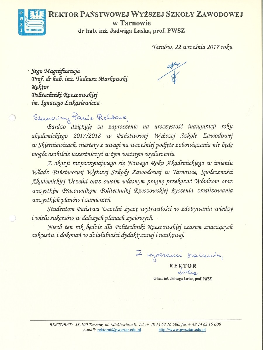 Ponad 30 listów gratulacyjnych z życzeniami sukcesów i dalszego rozwoju otrzymała Politechnika Rzeszowska z okazji rozpoczęcia nowego roku akademickiego. Ich autorami są przedstawiciele najwyższych władz państwowych, parlamentarzyści, duchowni i samorządowcy. Listy gratulacyjne dotarły także z różnych ośrodków naukowych z całej Polski.