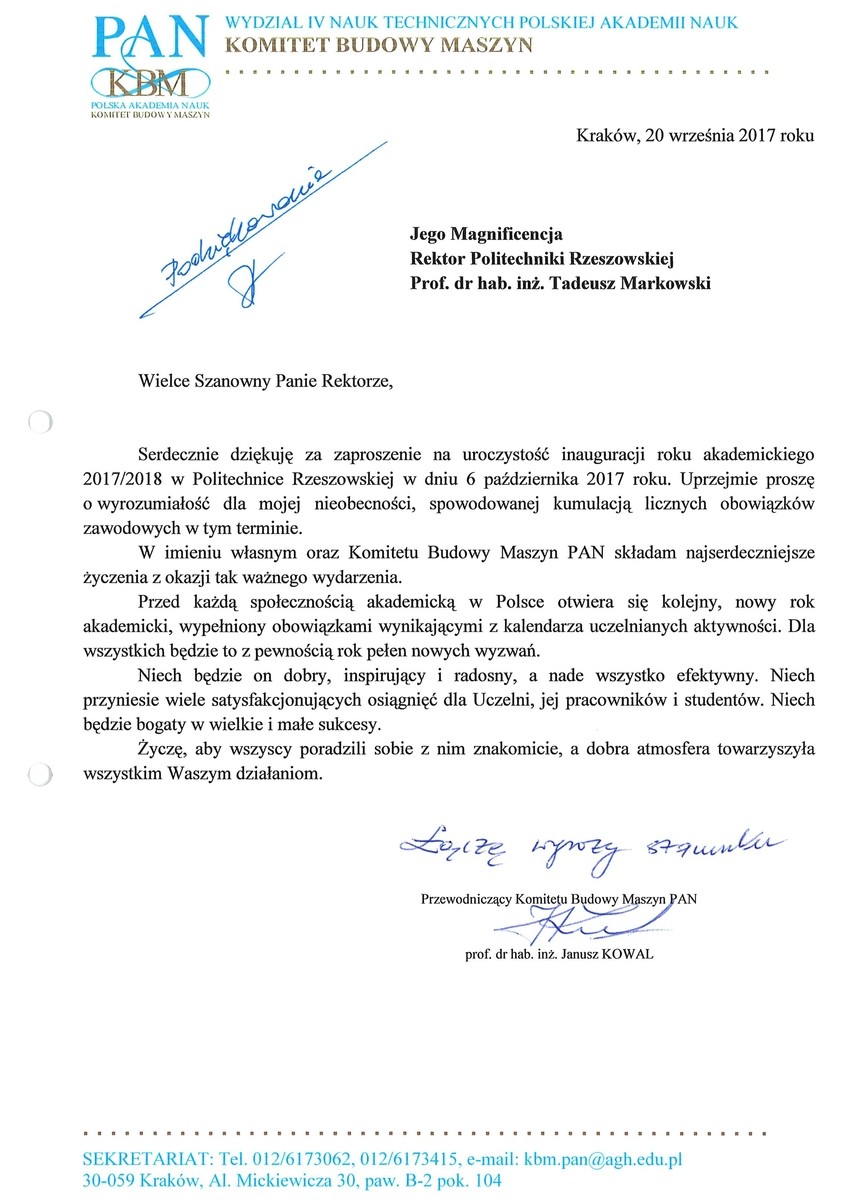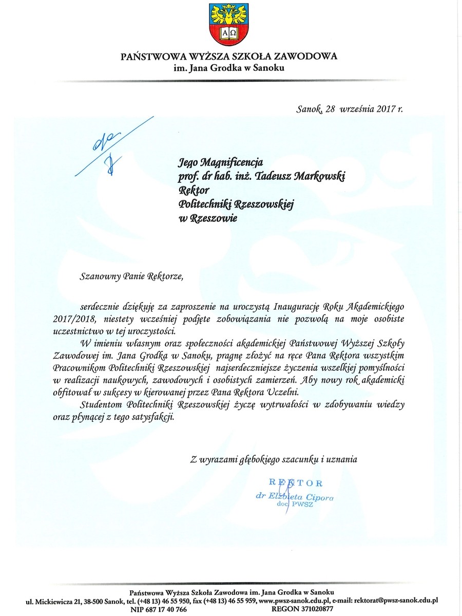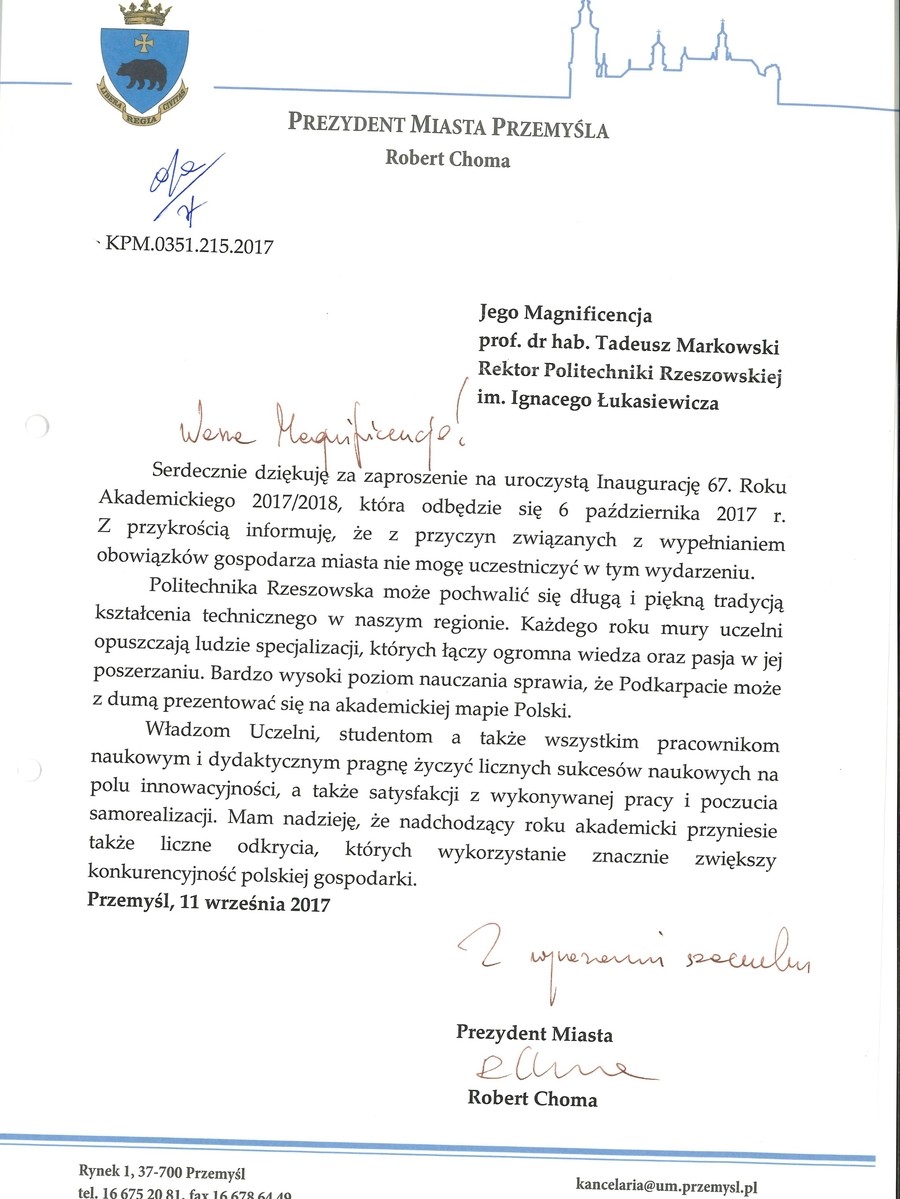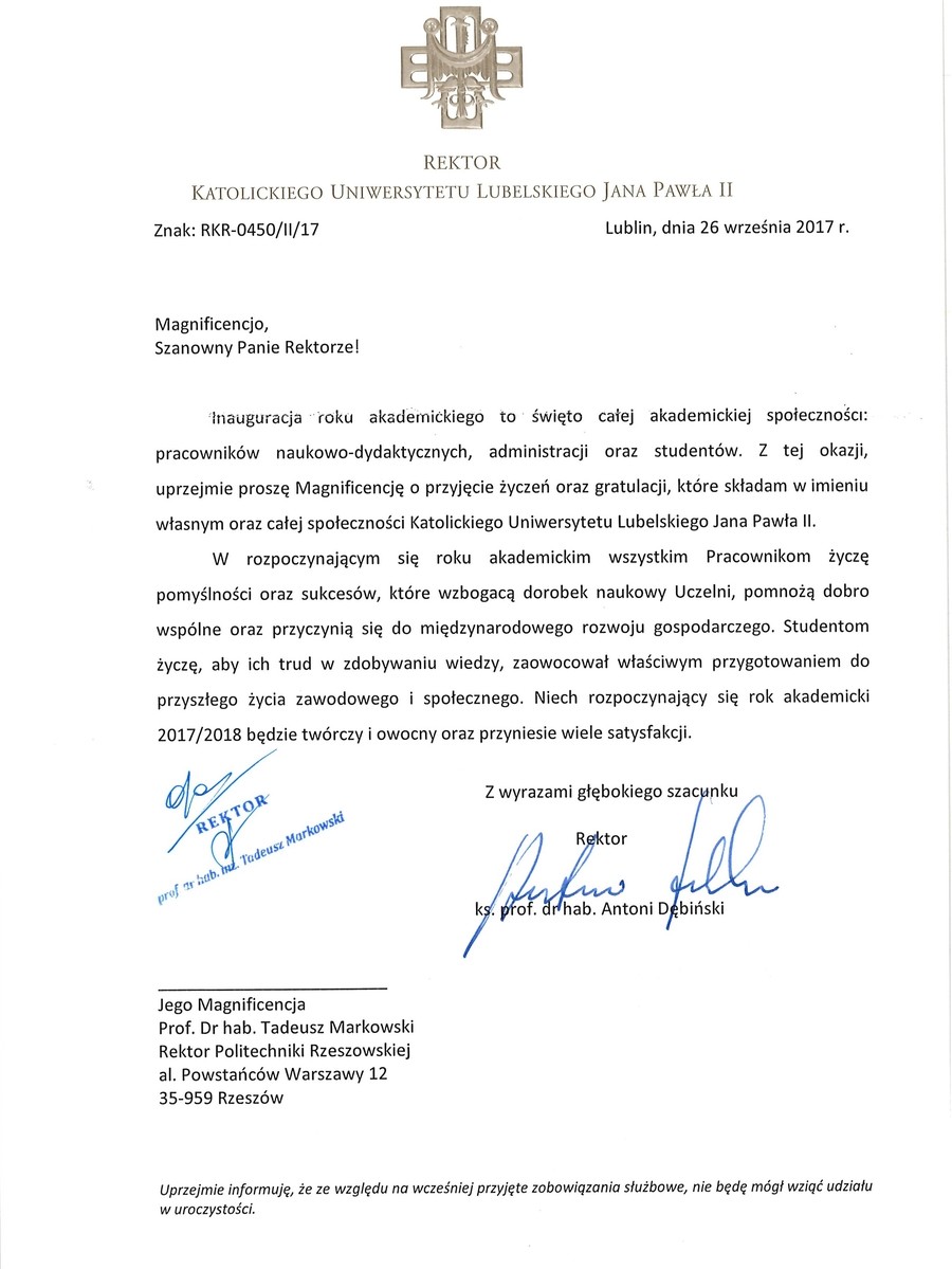 Ponad 30 listów gratulacyjnych z życzeniami sukcesów i dalszego rozwoju otrzymała Politechnika Rzeszowska z okazji rozpoczęcia nowego roku akademickiego. Ich autorami są przedstawiciele najwyższych władz państwowych, parlamentarzyści, duchowni i samorządowcy. Listy gratulacyjne dotarły także z różnych ośrodków naukowych z całej Polski.