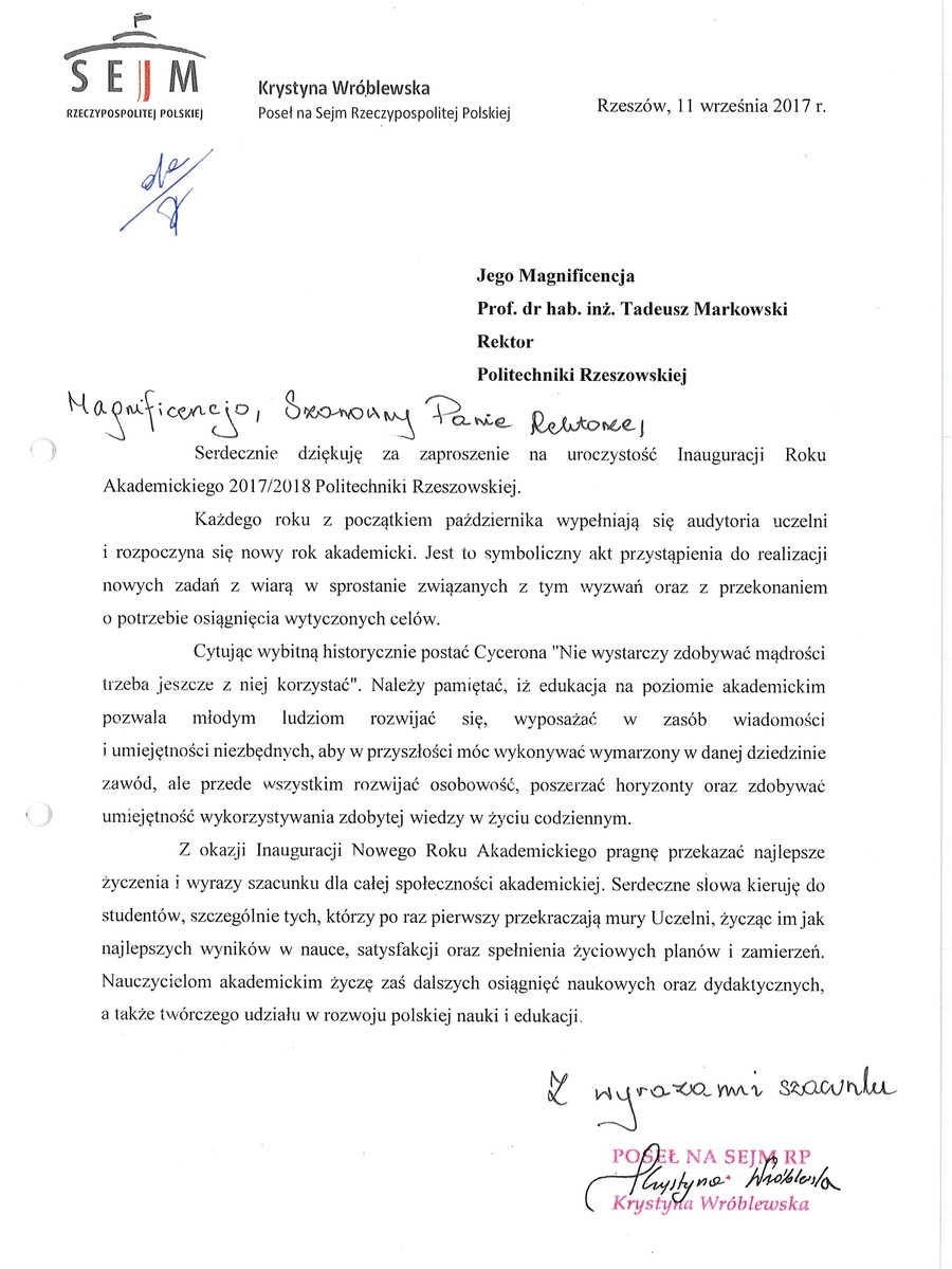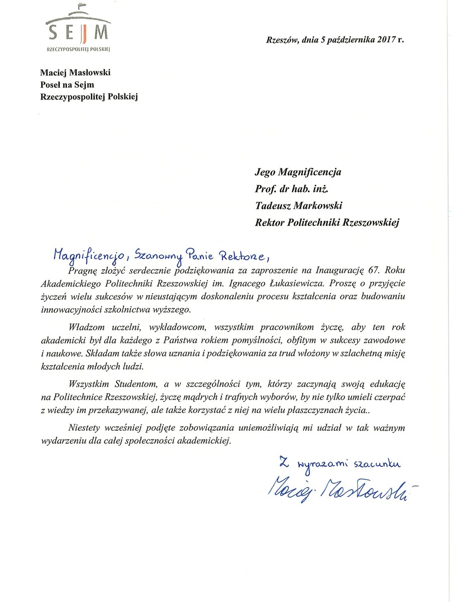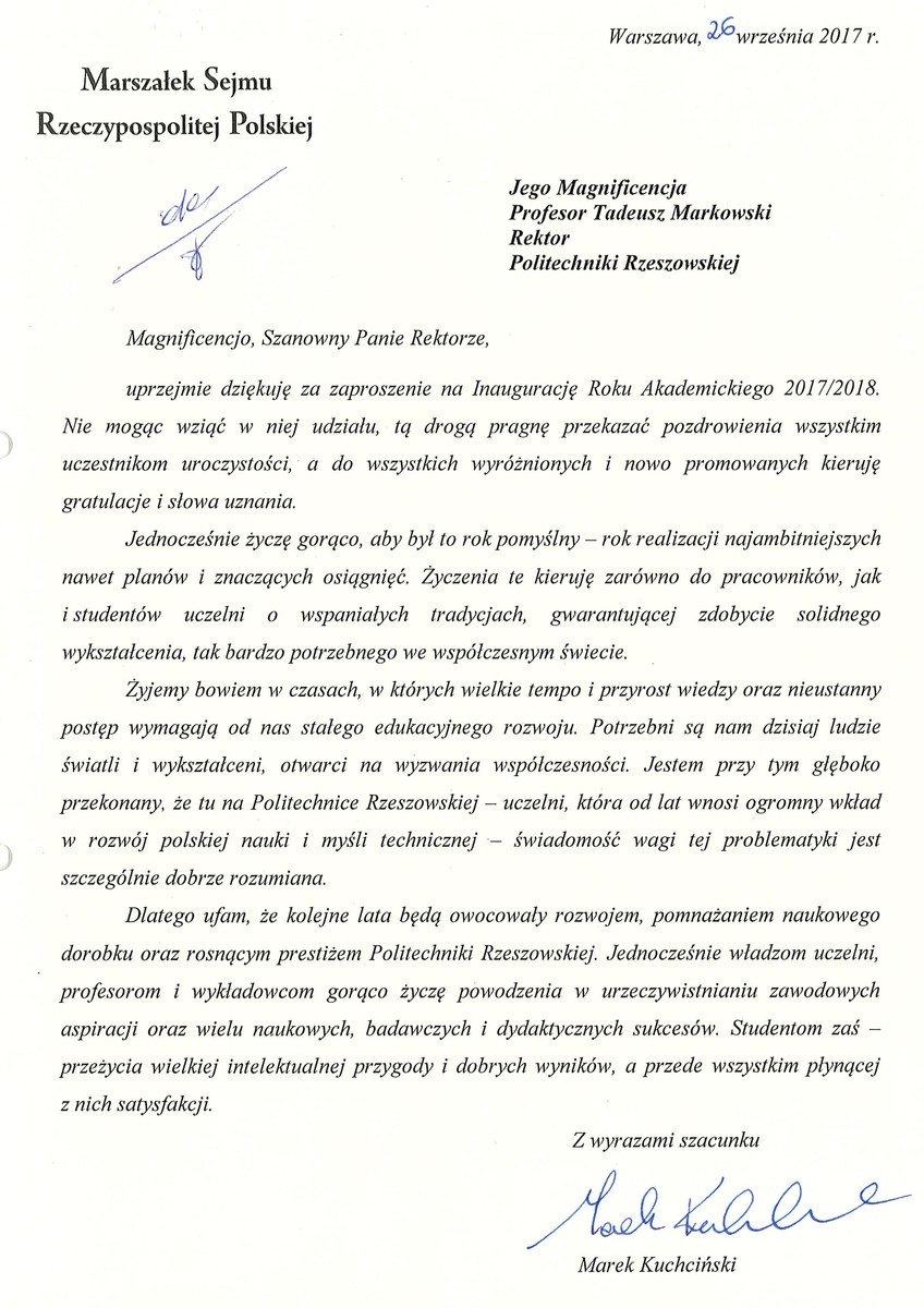 List przesłał także Marek Kuchciński, marszałek Sejmu RP. Ma on nadzieję, że kolejne lata będą owocowały rozwojem, pomnażaniem naukowego dorobku oraz rosnącym prestiżem Politechniki Rzeszowskiej. - Władzom uczelni, profesorom i wykładowcom gorąco życzę powodzenia w urzeczywistnianiu zawodowych aspiracji oraz wielu naukowych, badawczych i dydaktycznych sukcesów. Studentom zaś przeżycia wielkiej intelektualnej przygody i dobrych wyników, a przede wszystkim płynącej z nich satysfakcji - podkreślił marszałek Sejmu.