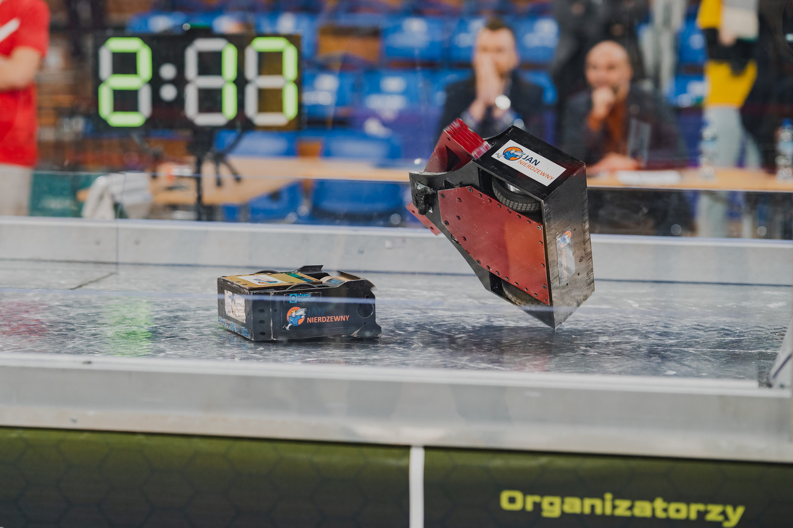 II dzień wydarzenia (sobota, 14 października) to dwa duże wydarzenia w kategorii otwartej - zawody Smash Bots i ROBO~motion. Kategoria otwarta oznacza, że każdy, niezależnie od wieku może startować w tych zawodach. Smash Botsy to jedyne takie wydarzenie w Polsce – masywne roboty o wymiarach 40 x 40 x 100 cm oraz wadze do 25 kg walczą ze sobą na specjalnie zaprojektowanej arenie mogącej wytrzymać każde uderzenie. Zdalnie sterowane roboty wyposażone w niezwykłe uzbrojenie toczą pojedynki podczas 3 minutowej rundy 1:1. W tym roku dodajemy specjalne przeszkadzajki, które mogą znacznie wpłynąć na przebieg walki. Piły, ostrza, młoty - to jedne z elementów, które na pewno spotkacie w konstrukcjach naszych zawodników. Tegoroczną nowością jest konkurencja Smash Bots Mini dla uczestników szukających mniejszych wrażeń. Roboty mogą ważyć maksymalnie 454g.